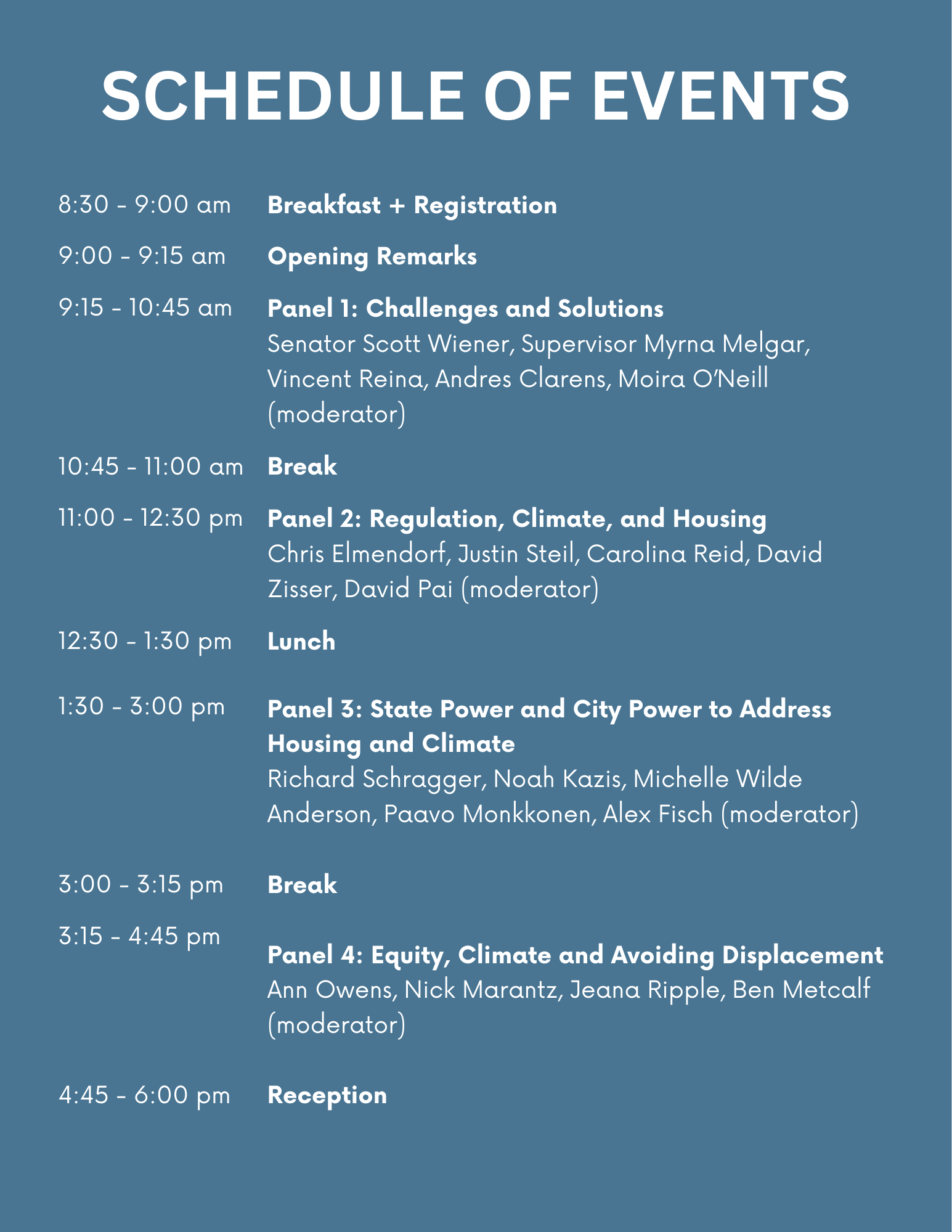 Panelists include nationally recognized scholars from MIT, Stanford Law School, UCLA, UC Berkeley, the University of Pennsylvania, the University of Michigan, UC Davis Law, and the University of Virginia, alongside senior leaders from the California Department of Housing and Community Development and the California Department of Justice, as well as California State Senator Scott Wiener.
