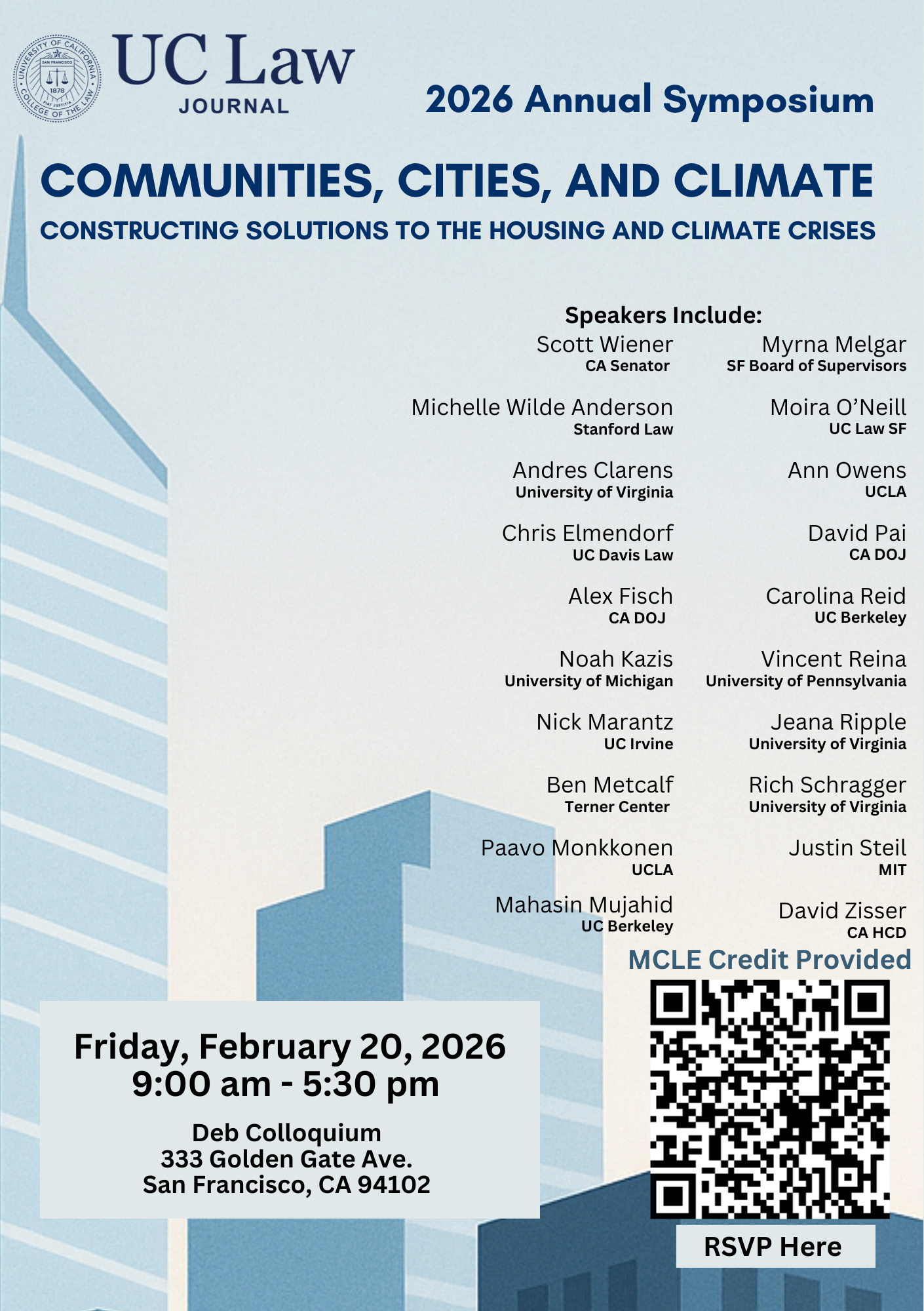 We are thrilled to invite you to our Volume 77 Symposium, “Communities, Cities, and Climate: Constructing Solutions to the Housing and Climate Crises,” taking place on Friday, February 20, 2026, from 9:00 AM to 5:30 PM in the Deb Colloquium at UC Law San Francisco.